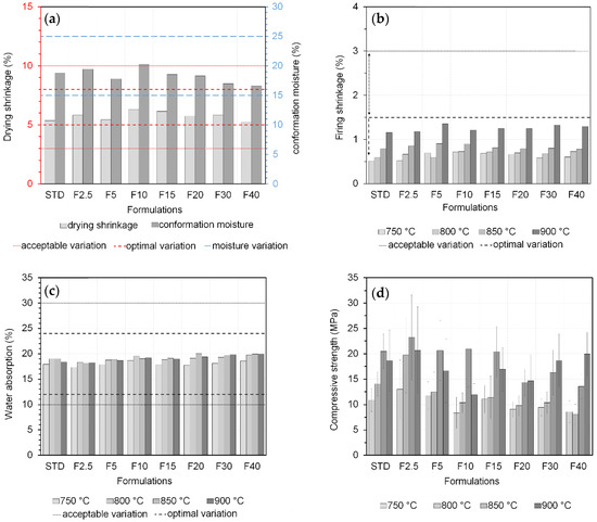 Technological characterization of the formulations: (a) moisture and drying shrinkage; (b) firing shrinkage; (c) water absorption; and (d) mechanical strength.