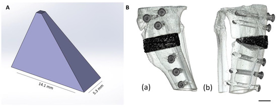 (A) A model of the wedge (SolidWorks, Dassault Systèmes SolidWorks Corp., Waltham, MA, USA): oblique view. (B) 3D reconstruction of the wedge (black) in the proximal rabbit tibia: (a) medial view; (b) craniolateral view. Scale bar = 5 mm.
