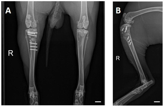 Post-surgery radiographs: (A) craniocaudal and (B) mediolateral beam path. The non-radiopaque PEEK plate allows for assessment of scaffold and cortices. Scale bar = 10 mm.