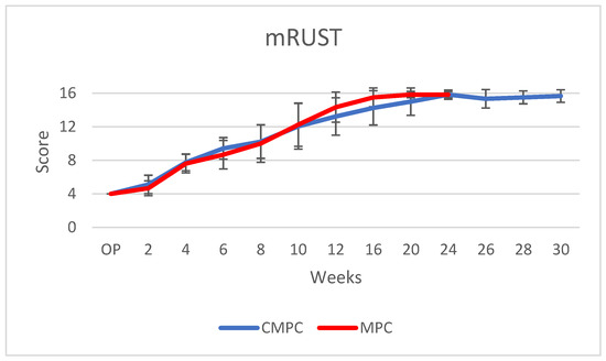 mRUST sum scores of CMPC and MPC from time of surgery to week 30. Plate removal in CMPC at week 24.