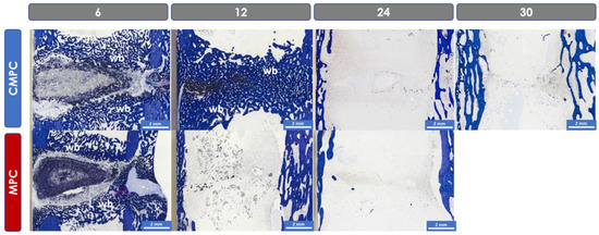 Histological thick sections (toluidine blue; magnification ×2.5/0.085) of the CMPC and the MPC after 6, 12 and 24 weeks and of the CMPC after 30 weeks. Blue: bone tissue. After 6 weeks, all scaffolds show a lighter-colored central area with an adjacent darker-colored zone. A cell-rich resorption zone is visible around the scaffolds. (wb) Woven bone is visible after 6 weeks in both materials, and after 12 weeks, it has already regressed in the MPC group.