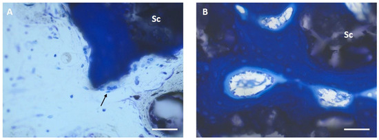 At the end of the respective observation periods, the animals were euthanized after sedation in accordance with animal welfare regulations. For this purpose, propofol (2–4 mg/kg, Narcofol®, CP-Pharma GmbH, Burgdorf, Germany) and pentobarbital (200–800 mg/kg, Narkodorm®, CP-Pharma GmbH, Burgdorf, Germany) were administered intravenously. The implanted tibiae were then removed and the soft tissue was dissected. The bone–implant composite including the PEEK plate was explanted using a diamond band saw (Cut-grinder, Messner GmbH, Oststeinbek, Germany); for this purpose, the PEEK plate was sawn through above and below the two screws adjacent to the scaffold. The preparation was then carried out as described in Section 2.1.5. Using the cutting–grinding technique according to Donath [34], thick sections (50–80 µm) were prepared by cutting a longitudinal section through the center of the PEEK plate in the mediolateral direction. Subsequently, the most central section from the center of the scaffold was stained with toluidine blue (0.1% toluidine blue O (Waldeck, Münster, Germany)) and then assessed semi-quantitatively with a microscope (Axio Imager Z.2, Carl Zeiss Microscopy GmbH, Oberkochen, Germany) using a scoring system by three people independently of each other (Table 4).