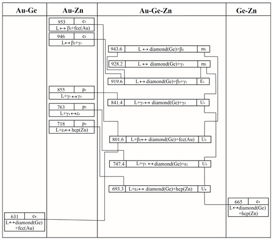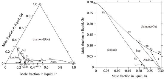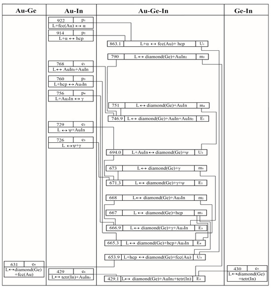 In this study, Figure 1 depicts the liquidus projection for the Au-Ge-In system. Additionally, Figure 2 outlines the reaction scheme for this system.