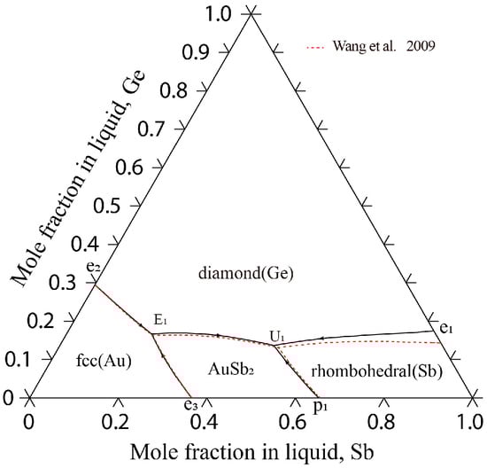The Au-Ge-Sb system was optimized by Wang et al. []. Afterward, Liu et al. [] updated the thermodynamic parameters of the Ge-Sb system. Liu et al. [] took into account the solubility of Ge in rhombohedral(Sb) during the optimization of the Ge-Sb system. The thermodynamic assessment of the Au-Ge-Sb system by Wang et al. [] was found to be in good agreement with the experimental data []. However, updated thermodynamic parameters for the Ge-Sb systems were provided by Liu et al. [], indicating a necessity to re-optimize the Au-Ge-Sb system based on the findings reported in reference [].