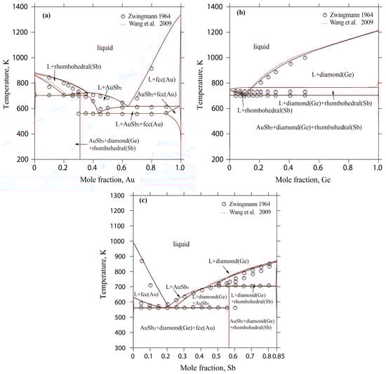 Calculated vertical sections of the Au-Ge-Sb system with the experimental results [] and the calculated results []: (a) Au-Ge0.1Sb0.9; (b) AuSb2-Ge; and (c) 15 at.% Ge.