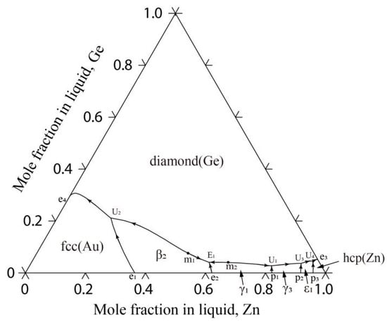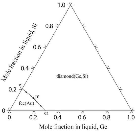 The calculated liquidus projection of the Au-Ge-Si system is shown in Figure 7; the Au-Ge-Si system presents a monotropic eutectic reaction including the liquid phase, fcc(Au) and diamond(Ge, Si). The monovariant curve from the Au-Si binary eutectic point e1 to the Au-Ge binary eutectic point e2 passes smoothly through a minimum point (599 K and 13.8 at.% Ge-11.7 at.% Si), which is consistent with the reported data (599 K and 8.8 at.% Ge-13.2 at.% Si) by Predel et al. [].