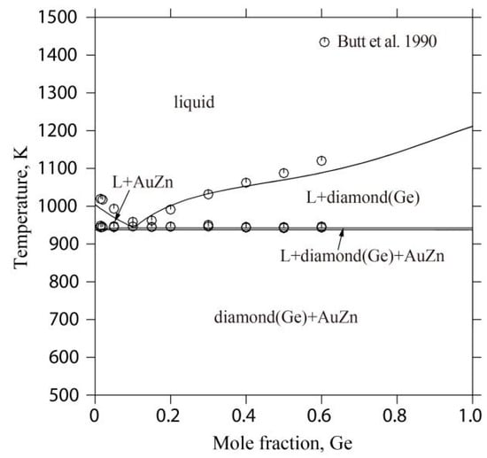 As for the phase equilibria of the Au-Ge-Zn system, the vertical section of AuZn-Ge was investigated by Butt et al. [] using differential thermal analysis (DTA) and the metallographic technique. Their experimental vertical section shows a pseudo-binary eutectic characteristic, and the eutectic composition and temperature were determined to be 12.2 ± 0.2 at.% Ge and 946 K, respectively. At the eutectic temperature, the solubility of Ge in the AuZn alloy was determined to be 1.3 atomic percent Ge, as reported in reference []. These experimental findings [] were utilized in the current calculations.