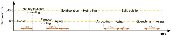 In this study, the ingots obtained in the previous section underwent hot rolling following solid solution treatment (held at 360 °C for 4 h). The elevated temperature promotes atomic diffusion within the alloy, reducing segregation and aiding in the welding of vacancies, resulting in compaction and reduced porosity.