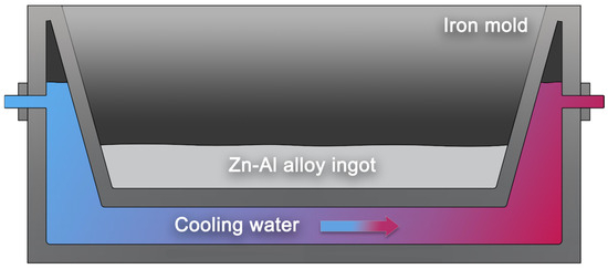 The corundum crucible is then returned to the resistance furnace for an additional 20 min at 680 °C, ensuring comprehensive mixing of the molten metal. In the final step, cooling water is continuously injected into the originally designed water-cooled mold (Figure 2). After purging the air and stabilizing the coolant flow, the molten metal is poured into the mold following thorough stirring. After cooling to room temperature, the Zn-22Al alloy ingot is obtained.