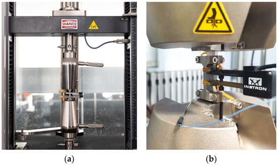 Considering the material’s characteristics and its application scenarios, an anti-buckling fixture, as depicted in Figure 5, was designed for specimens undergoing cyclic tests. The fixture design referenced the Chinese standard GB/T 3075-2021 [33]. Two parts of the fixture were securely fastened together using screws and nuts, with special design details ensuring that the fixture does not impede the specimen’s longitudinal sliding within it. This design prevents out-of-plane buckling of the specimen inside the fixture and ensures that it does not interfere with the clamping of the dynamic extensometer.