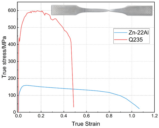 The true stress–strain curves of the Zn-22Al alloy, derived from the engineering stress–strain data of the monotonic tensile test, are illustrated in Figure 6. For comparison, a stress–strain curve of mild steel (Q235) was included, obtained at the same strain rate of 2 × 10−3/s. The monotonic test results indicate that mild steel typically exhibits a distinct yield plateau before hardening, while the Zn-22Al alloy demonstrates continuous yielding behavior and remarkable plastic deformation capability.