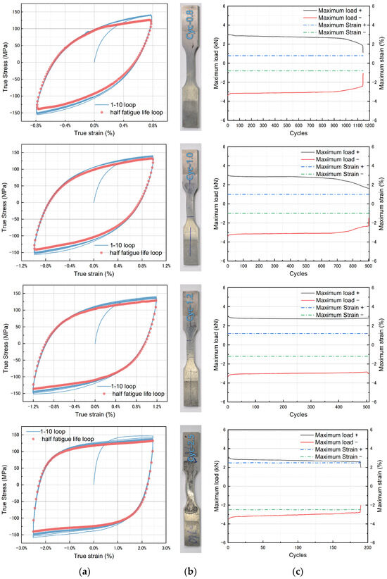 In LCF tests, specimens were clamped using the hydraulic wedge jaws of an INSTRON 8801 servo hydraulic fatigue testing system, with aluminum spacers positioned at both ends of the specimens inside the jaws. The tests were conducted under strain control at a rate of 2 × 10−3/s, employing a constant strain amplitude (ranging from ±0.8% to ±2.5%) until the specimen fractured, as depicted in Figure 4b. Dynamic extensometers with a gauge length of 12.5 mm were employed in the fatigue tests.