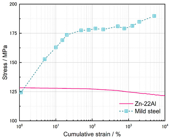 The evolution of stress as a function of cumulative strain for Zn-22Al alloy and mild steel.
