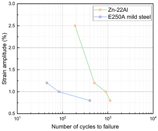 The fatigue life of the Zn-22Al alloy under various strain amplitudes is depicted in Figure 12, with a typical mild steel E250A curve also featured in the figure for comparison [41].