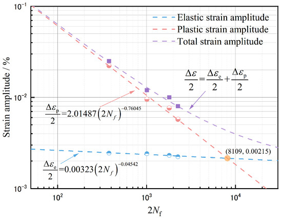 where is the total strain amplitude, is the elastic strain amplitude, is the plastic strain amplitude, is the stabilized stress amplitude at half fatigue life cycle, E is the Young’s modulus, is the cyclic strength coefficient, and is the cyclic strain hardening exponent. The material constants were obtained through a power-law regression curve fitting to stress amplitude versus plastic strain amplitude data, resulting in and .