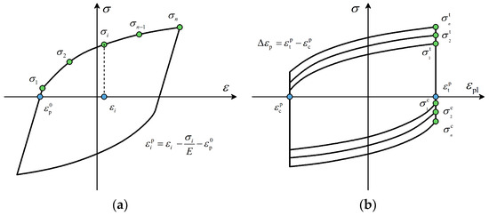 where and are the stresses in the first and last data pairs, respectively. At this point, Equation (8) can then be fitted to the pairs of data points . To ensure the accuracy and representativeness of the stress–strain hysteresis curve, the total least squares regression method was employed in this research. This method minimizes errors on both axes, contributing to a more precise depiction of the curve [45].