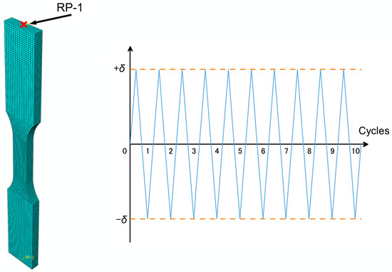 Cyclic loading, as illustrated in Figure 18, is implemented through the load module using a tabular data under the ‘amplitude’ tab on reference point RP-1. The displacement amplitude (δ) for each load condition is calculated by multiplying the strain amplitude by the parallel length (15 mm). Time intervals are determined by dividing the displacement amplitude by the strain rate. With 10 cycles of cyclic loading applied to the model, the step time for analysis is set as 10 times the cycle time. All degrees of freedom for nodes at both ends are restrained, except for axial displacement at the loading end. To closely emulate real testing conditions, rigid body constraints are enforced between the reference point and the clamping section at both ends of the specimen.