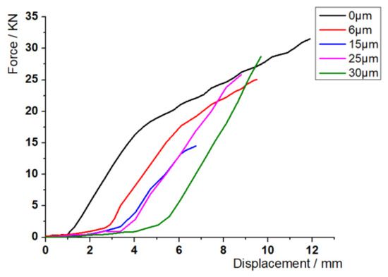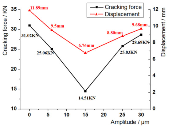 - When the amplitude increases from 0 μm to 15 μm and then to 30 μm, the cracking force and the displacement of the stretcher decrease at first and then increase. At 15 μm, the cracking force of the sample is the smallest and the deformation of the sample is the smallest.