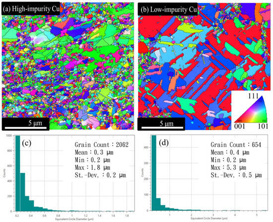Top-view EBSD orientation maps and grain size distribution histograms of the Cu electroplated layers fabricated using different additive formulas: (a,c) high-impurity Cu and (b,d) low-impurity Cu.
