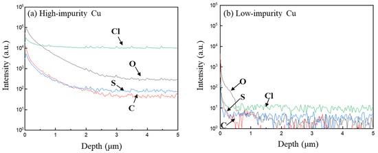 Figure 4 shows the SIMS results of intensity-depth profiles of possible impurities incorporated in the two Cu electroplated layers. Four impure substances, carbon (C), sulfur (S), oxygen (O), and chloride (Cl−), were detected, as they are the main components of the additives (PEG, SPS, Cl−) and acid electrolytes (H2SO4 and CuSO4). As shown in Figure 4, the impurity intensities in the high-impurity Cu sample were at least two to four orders of magnitude higher than those in the low-impurity Cu sample. In addition, the distribution of impurities exhibited an increasing profile for carbon, sulfur, and oxygen from the interior of the Cu layer to the vicinity of the Cu surface. The increasing profiles indicate that the three impure species might segregate to the Cu surface during the grain growth induced by self-annealing at room temperature. Nevertheless, chloride-related species were almost immobile in the Cu electrodeposited layer, which might be attributed to strong interaction between chloride and Cu atoms. The impurity intensities in the low-impurity Cu sample are nearly negligible as they approach the lowest detection limits of SIMS. In other words, the additive formula combining PEG, Cl−, and SPS at specific concentrations can effectively suppress the inclusion of impurities in the Cu electroplated layer.
