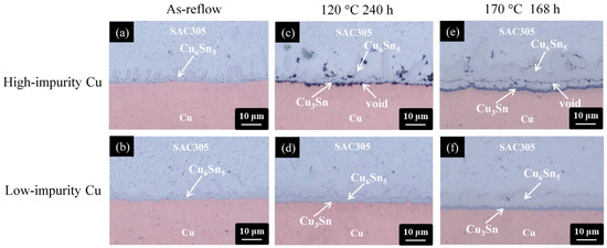 The notable distinction shown in Figure 5 indicates a significant impurity effect in the SAC305/Cu system. Voids were formed massively and propagated to form a crack at the joint interface when the Cu substrate contained a high level of impurity residues (high-impurity Cu). As shown in Figure 5c,e, the location of the voids/crack was at the IMC/Cu interface when the aging temperature was 120 °C, but moved upward to the interior of the IMC layer when aging at 170 °C. The formation of the voids/crack and their movement are highly associated with the change of atomic diffusion behavior between Sn and Cu caused by the change of aging temperature, which has been explained previously [21,43]. When the aging temperature is 120 °C, Cu is the dominant diffusion species, governing the growth of IMCs at the SAC305/Cu interface. The out-diffusion of Cu leaves vacancies on the departure side. These additional vacancies can be eliminated by migrating to the vacancy sinks (grain boundaries or dislocation) or accumulate to form voids. Once the vacancy sinks are eliminated by the incorporation of impurities, like the case in the high-impurity Cu, the latter will be accelerated and therefore voids are formed at the IMC/Cu interface. When the aging temperature was increased to 170 °C, the voids/crack formed inside the IMC layer, as shown in Figure 5e. The moving direction of the voids/crack from the Cu side to the solder side implies that the diffusion of Sn also contributes to the growth of IMCs. It was speculated that the diffusivity of Sn was increased when increasing the aging temperature, and with the diffusion of Sn entering the Cu side, new IMC was formed underneath the voids and encapsulated these voids in the IMC layer. The IMC structure became loose due to the void formation, providing fast diffusion paths to promote the interdiffusion of atoms, and therefore the Cu6Sn5 phase grew at an abnormally fast rate. Compared to the low-impurity Cu, the use of high-impurity Cu to construct the solder joint suffers accelerated void formation and faster IMC growth, exhibiting poor microstructural stability.
