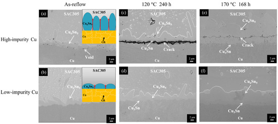 Regardless of the Cu electroplated samples, a thin IMC layer was formed at the SAC305/Cu interface after reflow reaction (as-reflowed), as shown in Figure 5a,b. Based on the compositional analysis of EDX (Cu of 56.1 at.% and Sn of 43.9 at.%), the IMC layer was identified as the Cu6Sn5 phase [42]. After thermal aging at 120 °C and 170 °C, a new IMC was formed at the Cu6Sn5/Cu interface and it was identified as the Cu3Sn phase based on the EDX results (73.4 at.% Cu and 26.6 at.% Sn). However, the microstructural evolution of the SAC305/Cu interface was different for the two Cu electroplated samples. For the high-impurity Cu sample, voids were formed and propagated along the interfaces, forming a continuous crack, as shown in Figure 5c,e. To clearly observe the void/crack formation, the joint samples in Figure 5c,e were further examined using SEM. From the color contrast shown in Figure 6, the formation of the void/crack at the interface was confirmed. For the low-impurity Cu sample, no voids or cracks were observed at the SAC305/Cu interface subjected to thermal aging at 120 °C and 170 °C, as shown in Figure 5d,f.