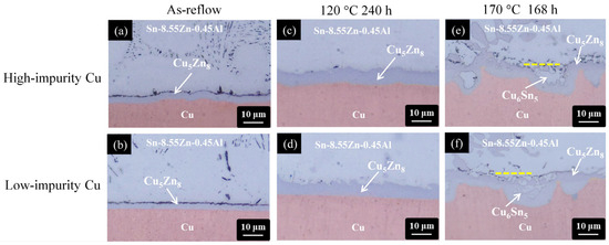 Cross-sectional OM micrographs of the Sn-8.55Zn-0.45Al/Cu interfaces subjected to various treatments: (a,b) as-reflow, (c,d) thermal aging at 120 °C for 240 h, and (e,f) thermal aging at 170 °C for 168 h. (The Cu electroplated layers in the first row and second row are high-impurity Cu and low-impurity Cu, respectively).