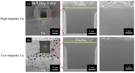 Cross-sectional FIB micrographs of the Sn-9Zn-5In/Cu interfaces subjected to thermal aging at 170 °C for 168 h: (a) high-impurity Cu and (b) low-impurity Cu.
