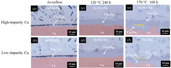 Figure 7 shows a series of cross-sectional OM micrographs of the Sn-9Zn/Cu interface after thermal aging at 120 °C and 170 °C for 240 h and 168 h, respectively. Regardless of the Cu electroplated samples, a thin IMC layer was formed at the Sn-9Zn/Cu interface before thermal aging (as-reflowed), as shown in Figure 7a,b. Based on the compositional analysis of EDX (Cu of 38.7 at.%, Zn of 59.7 at.%, Sn of 1.6 at.%), the IMC layer was identified as the Cu5Zn8 phase [44]. After isothermal aging at 120 °C for 240 h, the Cu5Zn8 phase thickened but no voids were observed at the interfaces on the two Cu electroplated samples, as shown in Figure 7c,d. When the thermal aging was performed at 170 °C for 168 h, the Cu5Zn8 phase started to fracture partially, detached from the interface, and migrated toward the solder matrix due to its brittle nature, as shown in Figure 7e,f [44]. The partial fracture of Cu5Zn8 generated some channels for the downward diffusion of Sn to the Cu side, and therefore a new IMC, identified as Cu6Sn5, was formed at the Cu5Zn8/Cu interface [45,46]. The microstructural characterizations of the Sn-9Zn/Cu interface subjected to isothermal aging are analogous for the high-impurity and low-impurity Cu samples, revealing that the impurity effect is insignificant.