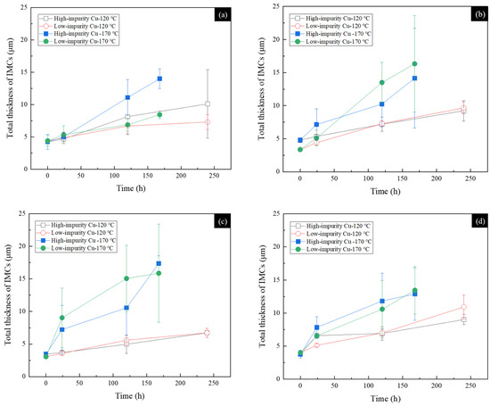 The relationship between the total thicknesses of the IMCs formed in the SAC305 solder joints and the aging time is depicted in Figure 12. In Figure 12a, the Cu6Sn5 phase grows at a faster rate in the high-impurity Cu solder joints subjected to thermal aging at 120 °C and 170 °C.