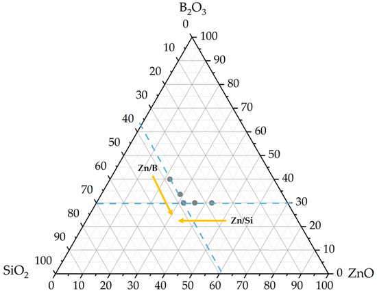 Compositional changes could not influence the position of the emission peaks; however, they could affect the emission intensity of the peaks. The emission intensity of the first group of samples (with fixed SiO2 content) increased with the ZnO/B2O3 ratio. The main reason for the increment was the substitution of ZnO for B2O3 in the host matrix, which enabled the formation of NBOs. Furthermore, the concentration of the trap centers increased with the addition of ZnO, which acted as a UV emission center [54]. Therefore, the optimum amount of B2O3 was chosen at 30 wt%. In the second group of samples (with fixed 30 wt% B2O3), ZnO was replaced by SiO2. The emission intensity of the second group of samples was higher compared to that of the first group of samples. This behavior is explained by the non-bridging oxygens phenomenon. The higher amount of NBOs made it easier to excite samples due to weakened bonds [27,28,29,30,31,32,33,34,35,36,37,38,39,40,41,42,43,44,45,46,47,48,49,50,51,52,53,54,55]. Nevertheless, the emission intensity of samples decreased with an increase in ZnO/SiO2. The ZnSi3825 sample had the maximum amount of ZnO; however, its emission intensity was lowest due to zinc abnormality. As a result, the maximum emission intensity was observed in the ZnB2927 sample, which corresponded to the intersection of the two groups in the ternary phase diagram. The optimum ZnO/B2O3 and ZnO/SiO2 ratios were determined to be 1.1 and 0.8, respectively.