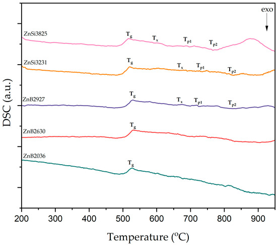 The characteristic glass temperatures of the samples were investigated by DSC analysis. Glass characteristic temperatures, detected as weak signals, were recorded at a heating rate of 5 K/min, and are shown in Figure 2. According to these DSC curves, endothermic peaks indicate glass transition temperatures (Tg), while the first exothermic peaks correspond to the onset crystallization temperatures (Tx) of glass samples. ZnSi glass samples exhibited two exothermic peaks that were related to crystallization temperatures (Tp); however, crystallization peaks were not observed in ZnB2036 and ZnB2630 glass samples.