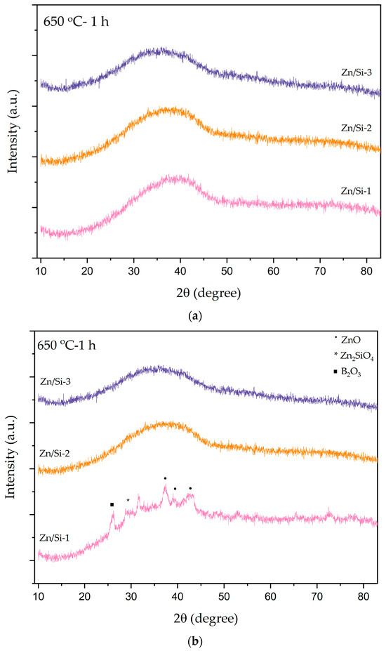 A heat treatment process was applied to ZnB2927, ZnSi3231, and ZnSi3825 glass samples at 650 °C, 750 °C, and 800 °C to determine structural changes. Figure 3 shows XRD patterns of both powder and bulk forms of samples at 650 °C for 1 h. Crystallization peaks for ZnO, Zn2SiO4, and B2O3 phases were detected in the ZnSi3825 bulk forms of samples; however, the powder forms of samples had amorphous structures. No crystallization peaks were revealed for ZnB2927 and ZnSi3231 samples, indicating the presence of amorphous structures. These two samples preserved the transparent appearance.