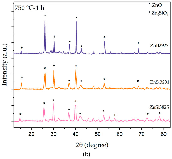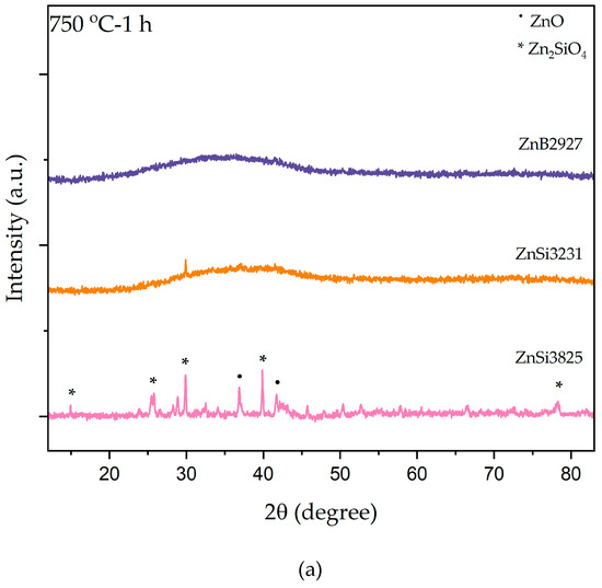 Figure 4 illustrates XRD patterns of both bulk and powder forms of samples at 750 °C for 1 h. As a result of heat treatment, ZnSi3825 bulk samples exhibited mainly opaque appearances, and ZnB2927 and ZnSi3231 bulk samples were opaque only on the surface. ZnO (zinc oxide) and Zn2SiO4 (willemite) phases were identified in the XRD patterns of powder and bulk forms of ZnSi3825. Although powder ZnB2927 and ZnSi3231 samples showed amorphous structures, surface crystallization was observed in these samples. ZnO and willemite phase peaks were present in the XRD pattern. When comparing XRD results at 750 °C, the formation of the willemite phase was more intense in the ZnSi3825 sample, which had the maximum amount of ZnO.