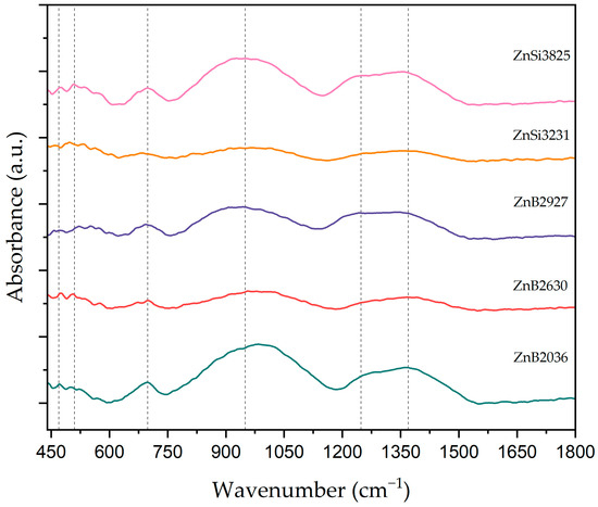 FT-IR spectra were used to investigate network structural units present in ZnO-SiO2-B2O3-Na2O glasses. Figure 6 shows absorption results of glass samples in the 400–1800 cm−1 wavenumber region. Two regions exist in the FT-IR spectrum. One consists of the main characteristic absorption bands between 400 and 1500 cm−1, while the other region is weak absorption peaks between 1500 to 4000 cm−1. It can be seen in Figure 6 that all glass samples exhibited six absorption bands, and band positions of the samples are shown in Table 3. Bands that appeared at ~470 cm−1 and ~505 cm−1 were assigned to weak absorption peaks of O-B-O bending vibrations and symmetric stretching vibrations of ZnO4, respectively [34,35,36,37,38]. Bending vibrations of bridging oxygens between B-O-B bonds in BO3 units or Si-O-Si symmetric stretching of bridging oxygen between SiO4 tetrahedral units can be induced to absorption peaks at ~699 cm−1 [34,39]. Vibrational modes of tetrahedral BO4 groups may be observed in the spectral range of 952–975 cm−1 [36]. A weak shoulder at 1235–1270 cm−1 can be attributed to B–O stretching vibrations of (BO3) units with non-bridging oxygen atoms [40,41,42]. The broad band observed in the spectral range at 1356–1387 cm−1 may be assigned to the asymmetrical stretching vibration of B-O-B in BO3 [39,40,42]. The asymmetrical stretching vibration of B-O-B in the BO3 band shifted towards a lower wavenumber with an increase in the ZnO content in the host matrix.
