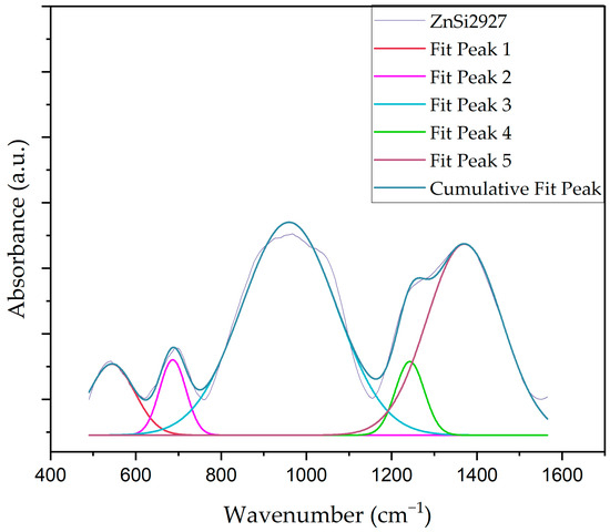 In Equations (1) and (2), A3 and A4 are defined by the area under the peaks, which are related to BO3 and BO4 units, respectively. Deconvoluted FT-IR spectra of the ZnB2927 sample are given in Figure 7, and deconvolution peak center (cm−1) and area under the peaks are given in Table 4. According to Table 4, the N3 value increased with the addition of ZnO to the host matrix, which indicates that [BO4] units transformed into [BO3] units. The maximum amount of NBOs was obtained using the ZnSi2927 sample.