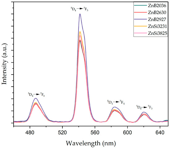 For these reasons, ZnO-B2O3-SiO2-Na2O glasses appear to be an attractive host matrix for doped-with-rare-earth ions. The electron shell structure of all trivalent lanthanide ions is unfilled and consists of 4fN electrons, where N ranges from 1 to 14. Optical transitions are related to 4f electrons [25]. Terbium ions are preferred as an activator material, as Tb3+ ions, which exhibit green emission even at low concentrations, have a high luminescence behavior in the visible band. The transition of Tb3+ ions arises from the Laporte-forbidden metastable state 5D4 to the lower states 7F6 (487 nm), 7F5 (542 nm), 7F4 (585 nm), and 7F3 (620 nm). Even small quantities of Tb3+ ions can be added to the host matrix; a strong green emission at 542 nm has been observed with the naked eye [26,27].