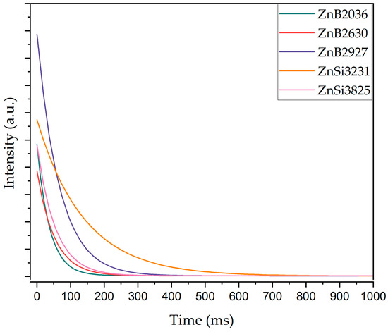 According to the decay curves, firstly, the luminescence lifetime increased from 51.7 to 139.9 ms with the increment in ZnO content; however, the lifetime of the ZnSi3825 sample decreased to 110.3 ms due to zinc abnormality. Consequently, the ZnSi3231 sample exhibited the maximum luminescence lifetime.