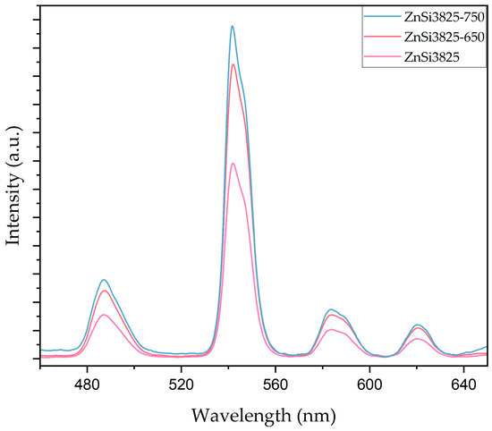 After heat treatment at 650 and 750 °C for 1 h, photoluminescence spectra measurements were taken to investigate the effect of willemite and zinc oxide phases on luminescence behavior. Figure 11 illustrates phosphorescence spectra results for ZnSi3825 glass and heat-treated glass samples. Wavelength position did not change with the heat treatment, while the emission intensity of the samples increased. According to XRD patterns of the samples, the increase in concentration of ZnO content facilitated the formation of willemite and zinc oxide phases. Willemite and zinc oxide phases act as a UV emission center; therefore, the emission intensity of heat-treated samples was higher compared with that of the as-cast transparent samples [17,57].