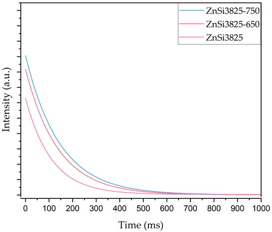 Decay curves of untreated and heat-treated (at 650 °C and 750 °C /1 h) ZnSi3825 glass samples after excitation with the 363 nm UV lamp.