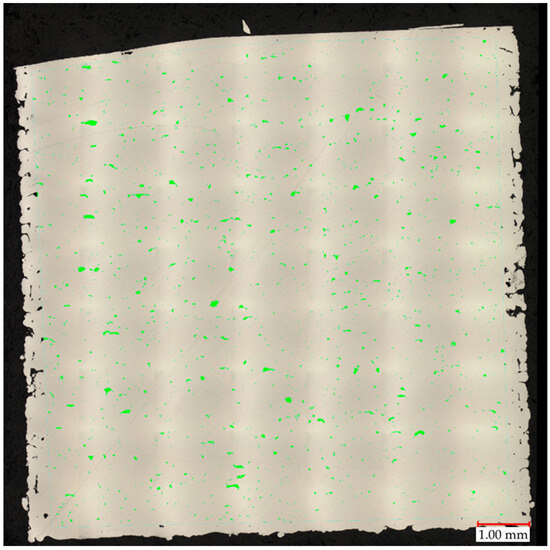 A properly made drying process made the gas porosity (caused by moisture) marginal. Visible increased porosity on the side parts of the sample was caused by the same outline perimeter shell parameters used for all samples. For the measurement, these porosities were not taken into account. Only green-highlighted pores were considered in porosity calculations. As is visible in Figure 3, irregular voids are mostly caused by a lack of fusion phenomenon [32,33]. This factor is strictly dependent on process parameters, which is why the number of this kind of void fluctuation depends on the process parameters used.
