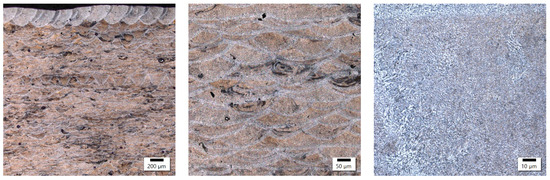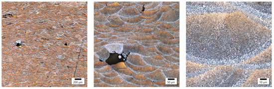 In these samples, the laser power differed by only 20 W, with the main difference appearing in the different exposure velocities, which was one-third higher in the sample with lower energy density, and the hatching distance, which was almost twice as high in the sample with lower energy density. The microstructure of the No. 25 and No. 36 samples is shown in Figure 4 and Figure 5.