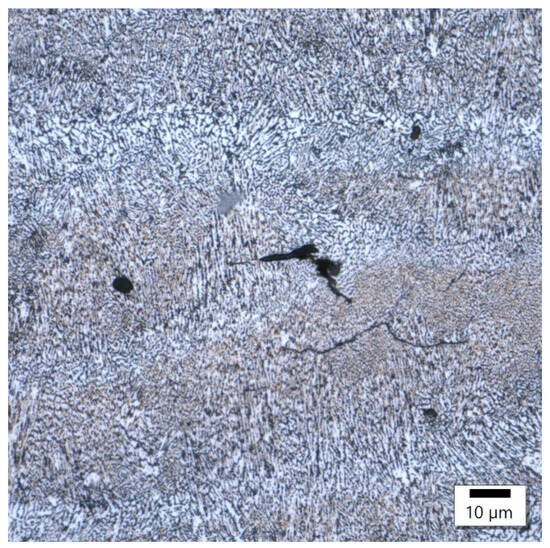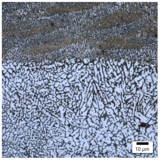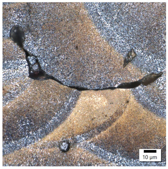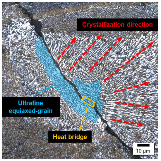 In sample number 26 (Figure 10), two solidification cracks separated the fine-grained zone from the area of the columnar grain, whose growth was dictated by a small, 10 μm width bridge allowing for further heat flow. The image of sample 34 (Figure 11) then indicates that porosity formed at the boundary of the melting pools.