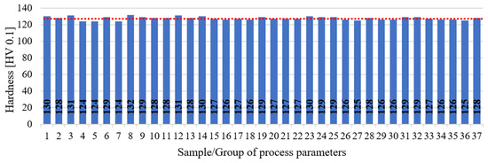 Hardness measurement results are presented on the chart in Figure 14. The average hardness value was 128 HV 0.1 with a standard deviation of 2.5 HV 0.1. The majority of results for individual parameter/sample groups fell within this range of deviation. Hence, it can be concluded that within the investigated range of parameter values, no significant changes in properties in relation to material hardness occurred. These findings are further supported by microstructural analysis results. The dotted red line indicates the mean value for all measurements.
