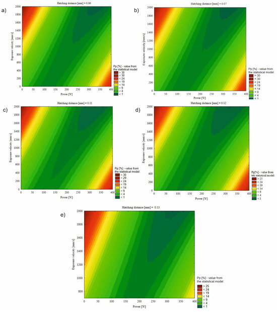 Surface response maps of the quadratic regression model for the constant hatching distance: (a) 0.06, (b) 0.07, (c) 0.11, (d) 0.12, and (e) 0.13.