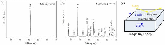 XRD spectra of n-type Bi2(Te,Se)3 thermoelectric material: (a) the commercial bulk material, (b) ground Bi2(Te,Se)3 powders, and (c) schematically illustrating the Bi2(Te,Se)3 substrate with a preferred orientation of (1 1 0).