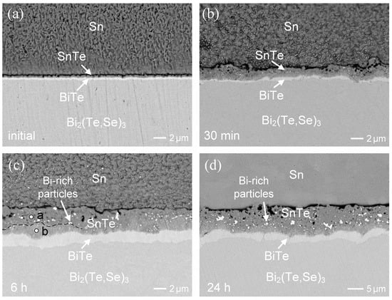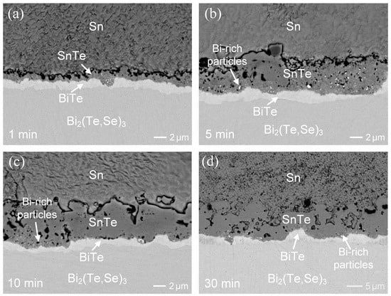 Figure 2c shows the interfacial results after reacting for 10 min. The dark SnTe layer, measuring approximately 4.5 µm in thickness, appeared notably thicker than the bright BiTe layer, which was approximately 1.6 thick. Evidently, the SnTe phase was composed of large particulates with presence of voids. Similarly, small bright particles were observed within SnTe phase near the BiTe layer. Based on the contrast, these particles were suggested to be Bi precipitates, likely formed due to an oversaturation of Bi. Upon increasing the reaction time to 30 min (Figure 2d), in addition to the growth of IMC layers, the interfacial microstructure remained stable with no significant evolution.