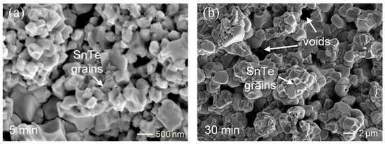 To further explore the morphology of SnTe phase, the Sn solder of the reaction couple was removed through deep etching. Figure 3a,b display the top-view SEI micrographs showing displaying the grain morphologies of the SnTe phase after 5 min and 30 min of reaction, respectively. The SnTe phase exhibits round grains with numerous voids. In the 5-min sample, the grain size was less than 500 nm. In contrast, the grain size increased to approximately 2 µm in the 30-min sample. This indicated that the grain coarsening occurred with aging time during the soldering reaction. From a series of microstructural observations, the SnTe phase, composed of fine grains embedded with Bi-rich particles, exhibited grain coarsening and void formation. This void formation was attributed to Bi dissolution into the solder, resulting in voids within the SnTe phase.