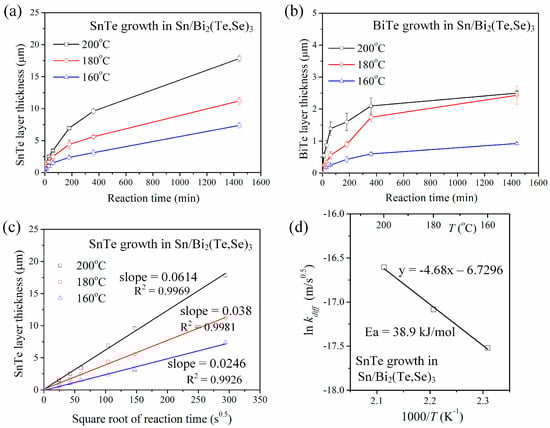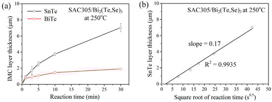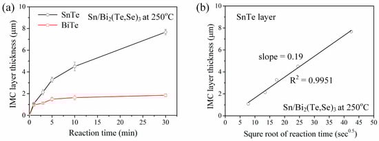 Figure 4a show the average thicknesses of both the SnTe and BiTe layers plotted against aging time at 250 °C. The SnTe layer exhibited a continuous increase in thickness with aging time. In contrast, the growth of the BiTe layer gradually ceased after 5 min of reaction and maintained a thickness of ~1.6 µm. The IMC growth can be described by the following equation []: