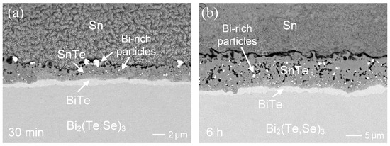 BEI micrographs showing the Sn/Bi2(Te,Se)3 reactions at 200 °C for (a) 30 min and (b) 6 h.